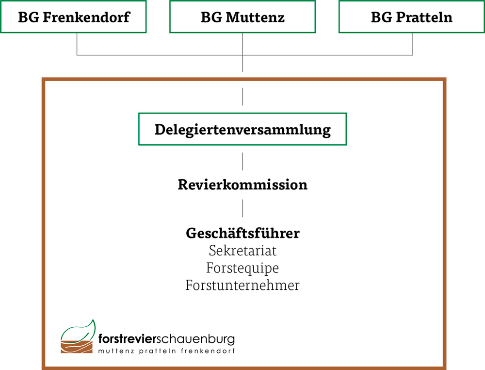 An der Spitze des Forstreviers steht die dreiköpfige Revierkommission. Sie wurde an der Delegiertenversammlung vom 19. Mai 2021 gewählt und vertritt die drei Bürgergemeinden. Präsident der Revierkommission ist Sven Bill (Waldchef Pratteln). Mit Hansueli Vogt (Waldchef Muttenz) und Willi Martin (Waldchef Frenkendorf) sind auch die anderen beiden Gemeinden in der Leitung vertreten.