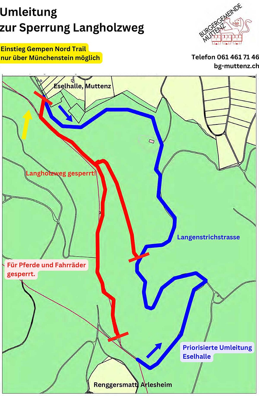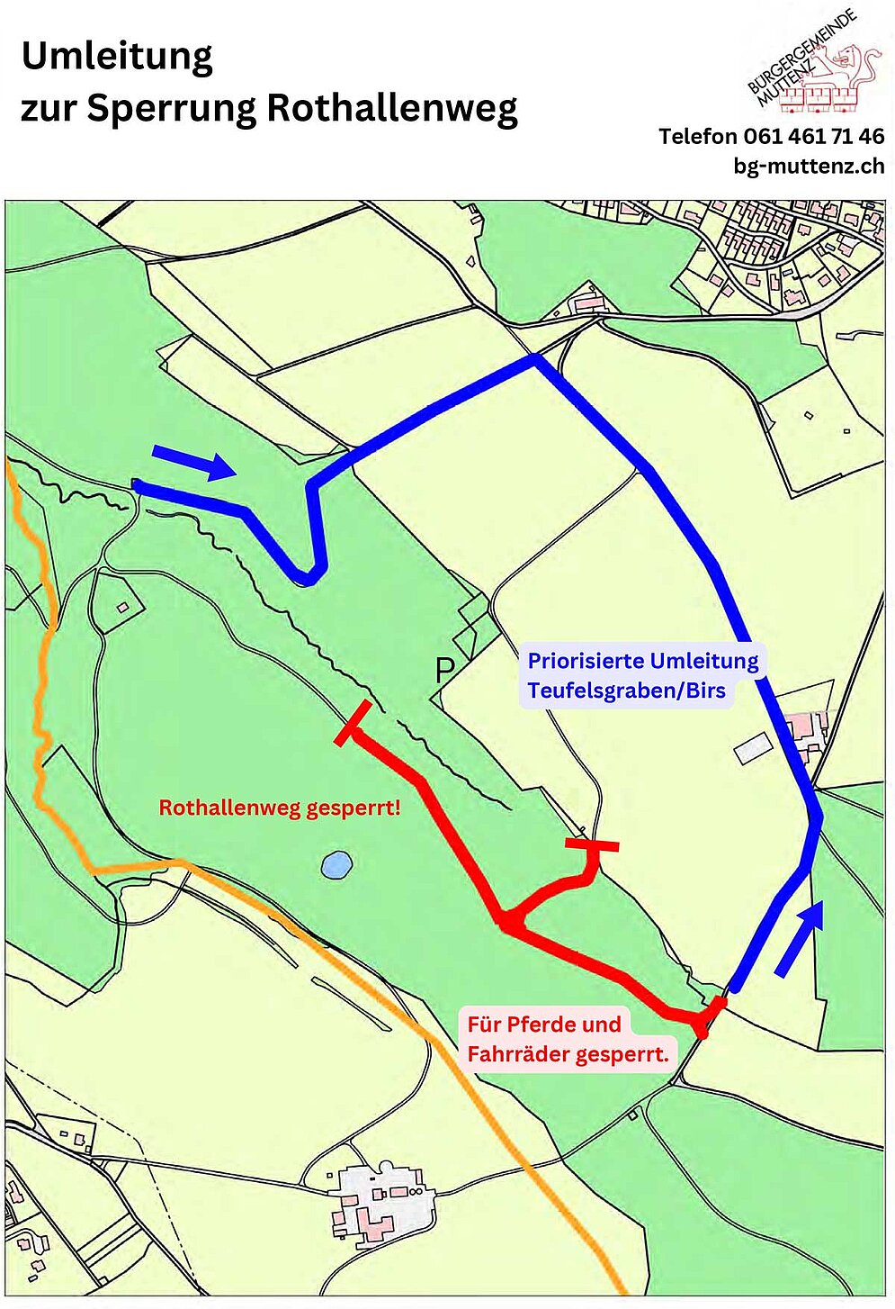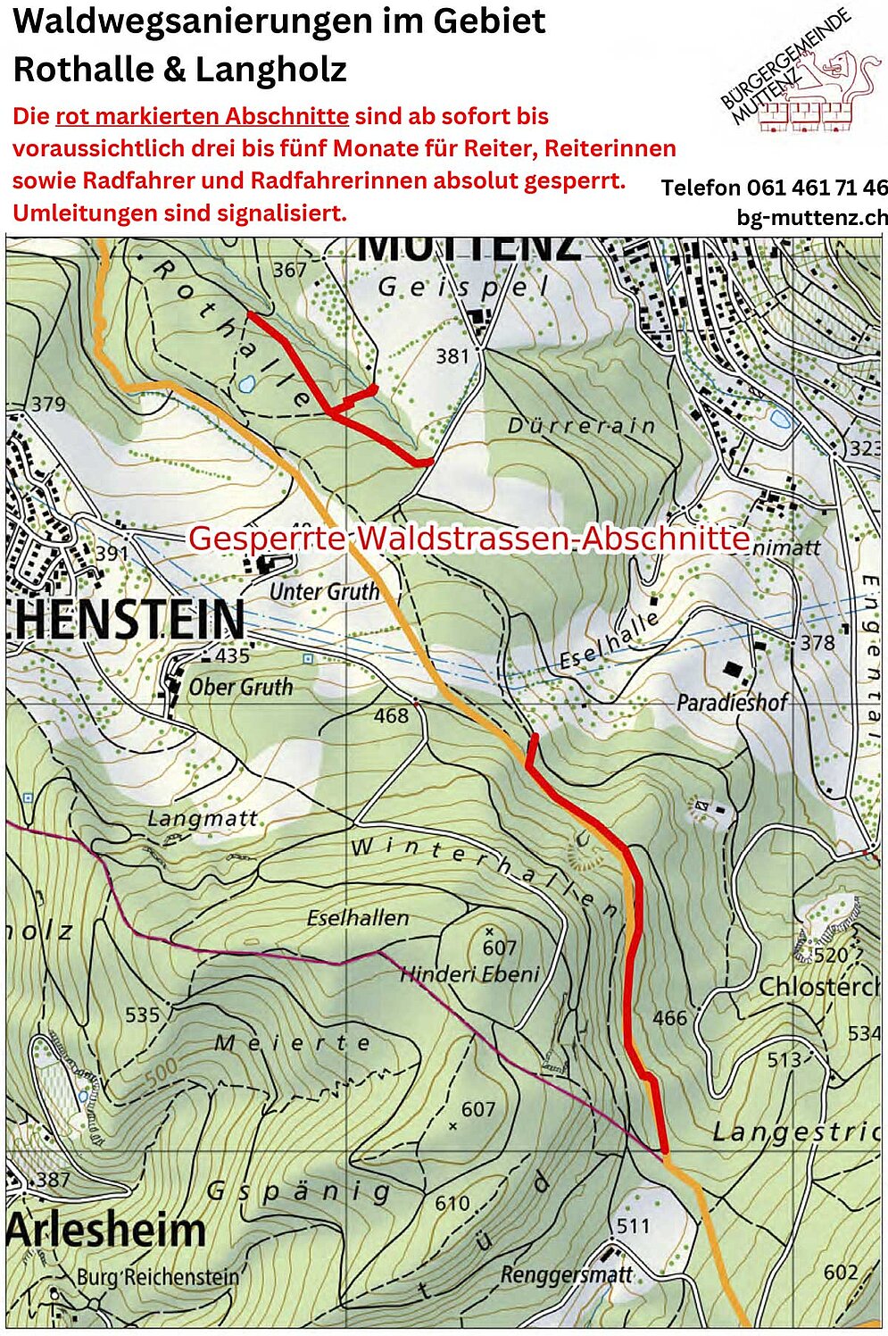 Die Bürgergemeine Muttenz saniert in den kommenden Monaten mehrere Waldstrassen in den Gebieten «Rothallen» und «Eselhallen» in Muttenz. Dabei muss die oberste Schicht der Waldstrasse erneuert werden. Um Schäden an der neu eingebrachten Mergelschicht zu verhindern, darf die Waldstrasse nicht befahren oder mit Pferden begangen werden. Eine Umleitung ist signalisiert. Für Fragen steht Ihnen die Bürgergemeinde Muttenz unter Telefon 061 461 71 46 gerne zur Verfügung. Wir danken Ihnen für Ihr Verständnis.